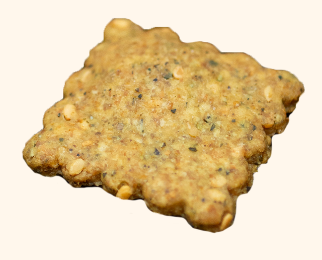 Farine complète de petit épeautre*, levain naturel (farines complètes de seigle et grand épeautre*, eau filtrée), farine de maïs*, huile d’olive vierge extra*, graines de sésame*, sel de Guérande, plantes aromatiques**.