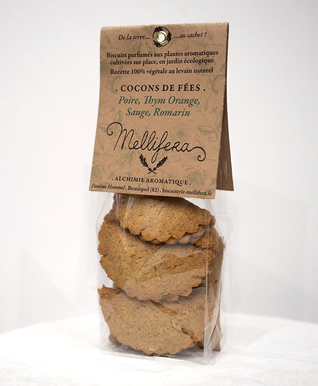 Farine complète de petit épeautre*, sucre de canne*, levain naturel (farines complètes de seigle* et de grand épeautre*, eau filtrée), poudre d’amande*, pêche / poire, huile de coco vierge*, huile d’olive vierge extra*, jus de citron*, plantes aromatiques (fleur de sureau (sambucus nigra)**, verveine citronnée (aloysia citrodora)**, fleur d'acacia (robinia pseudoacacia)** / thym orange (thymus fragrantissimus)**, sauge (salvia officinalis)**, romarin (salvia rosmarinus)**), sel de Guérande.