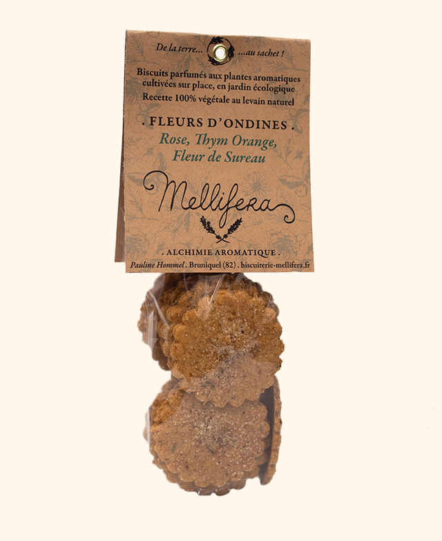 Farine complète de petit épeautre*, sucre de canne*, poudre d’amande*, levain naturel (farines complètes de seigle* et de grand épeautre*, eau filtrée), huile de coco vierge*, huile d’olive vierge extra*, plantes aromatiques** (rose (variétés parfumées), thym orange (thymus fragrantissimus), fleur de sureau (sambucus nigra) / violette (viola odorata), mauve (malva sylvestris), lavande (lavandula angustifolia), sel de Guérande.